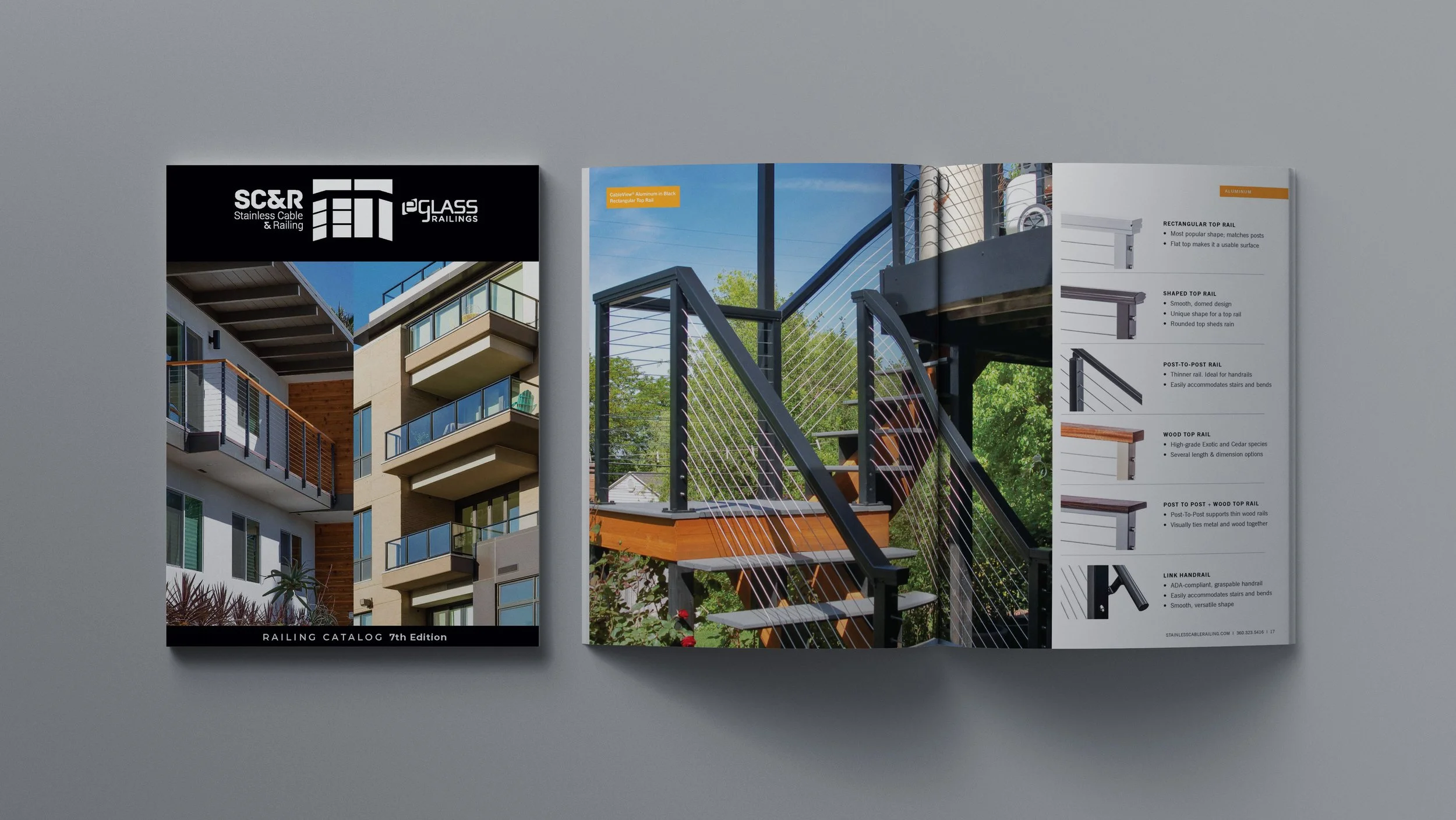 Inspired by SC&R customer’s custom deck that utilized both glass and cable infills, I decided to try putting the railing graphics together as if it was one continuous railing. The results worked really well to combine these two established brand logos and leadership approved two versions of the logo—a horizontal version along with a more vertical version to allow for some future design flexibility.