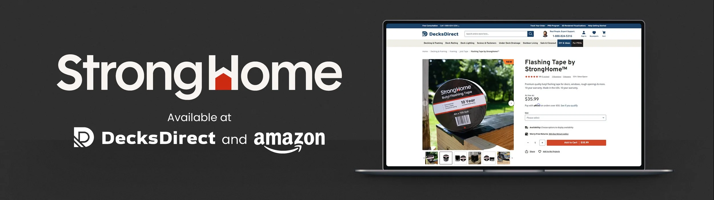 The first product to be introduced under the StrongHome brand, was butyl flashing tape also known as joist tape, which is often used to protect the framing of a deck but can also be used to protect the framing around doors, windows, or other rough openings. This high-quality butyl flashing tape protects against moisture damage, rot, mold, and mildew to make sure your project will last.